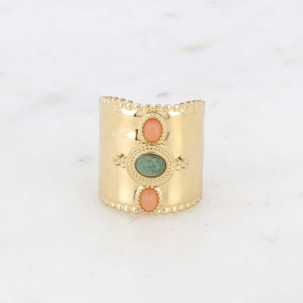 Bague large légèrement martelée en acier inoxydable composée de 3 pierres naturelles ovales sur un anneau large aux contours arrondis.