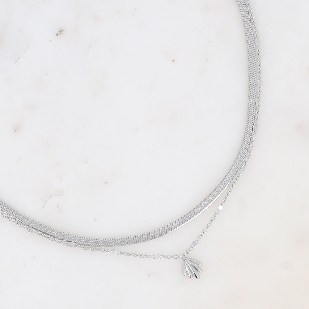COLLIER 2 RANGS- MAILLE MIROIR ET PETIT PENDENTIF FEUILLAGE