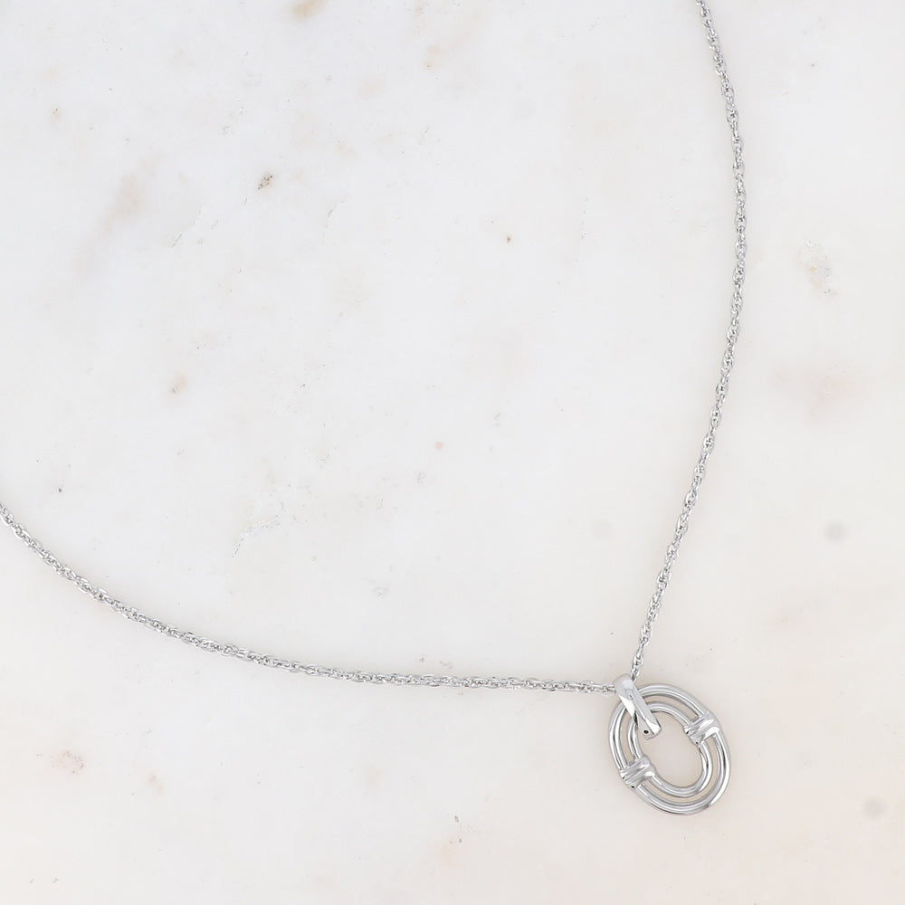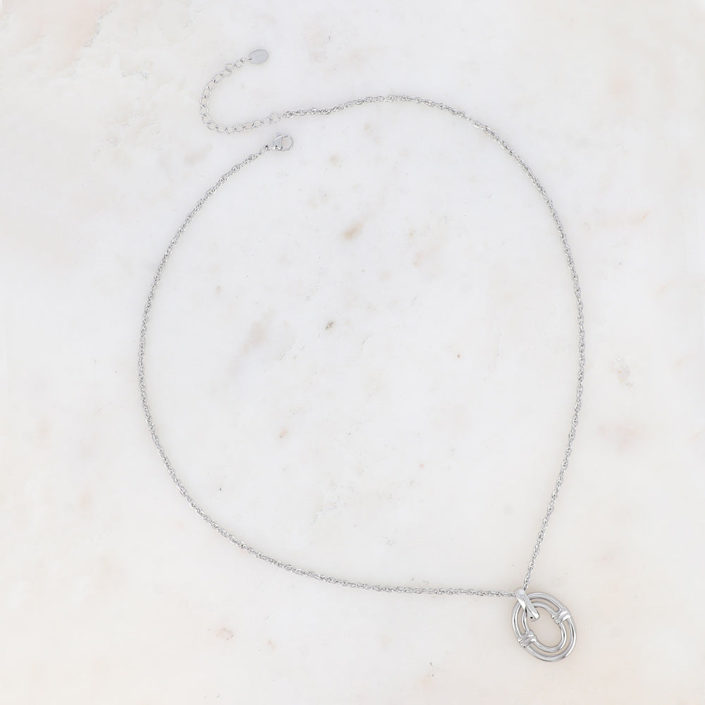 Collier sur chaîne en acier inoxydable composé d'un grand pendentif en forme de 2 anneaux ajourés.