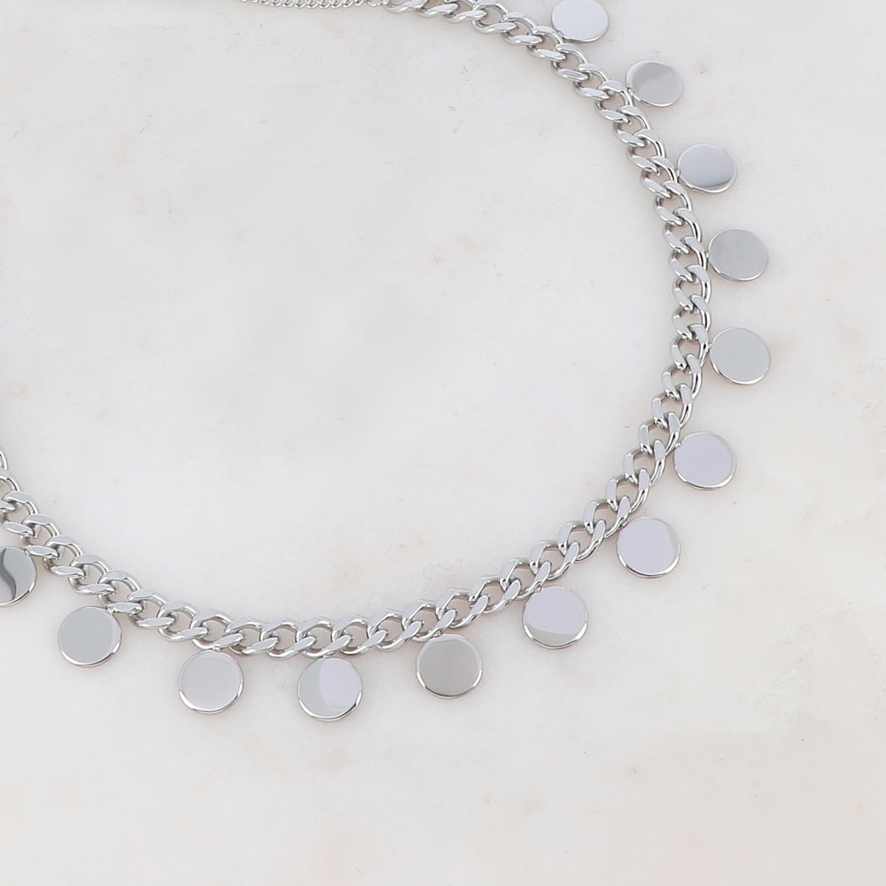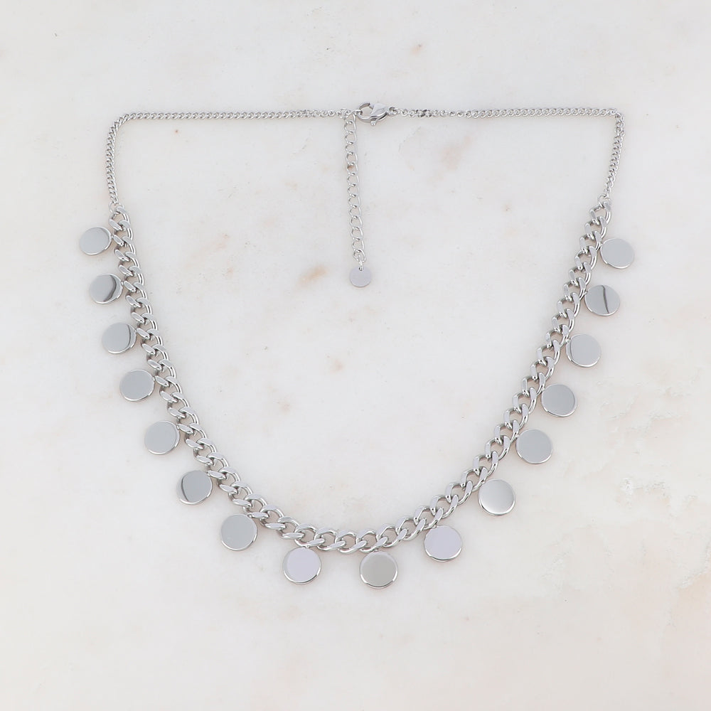 Collier en maille gourmette embelli de pampilles rondes lisses. Fermoir mousqueton et chaînette réglable.