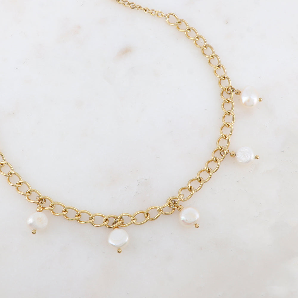 Collier en maille sur chaîne avec fermoir mousqueton et chaînette réglable embelli de perles d'eau douce.