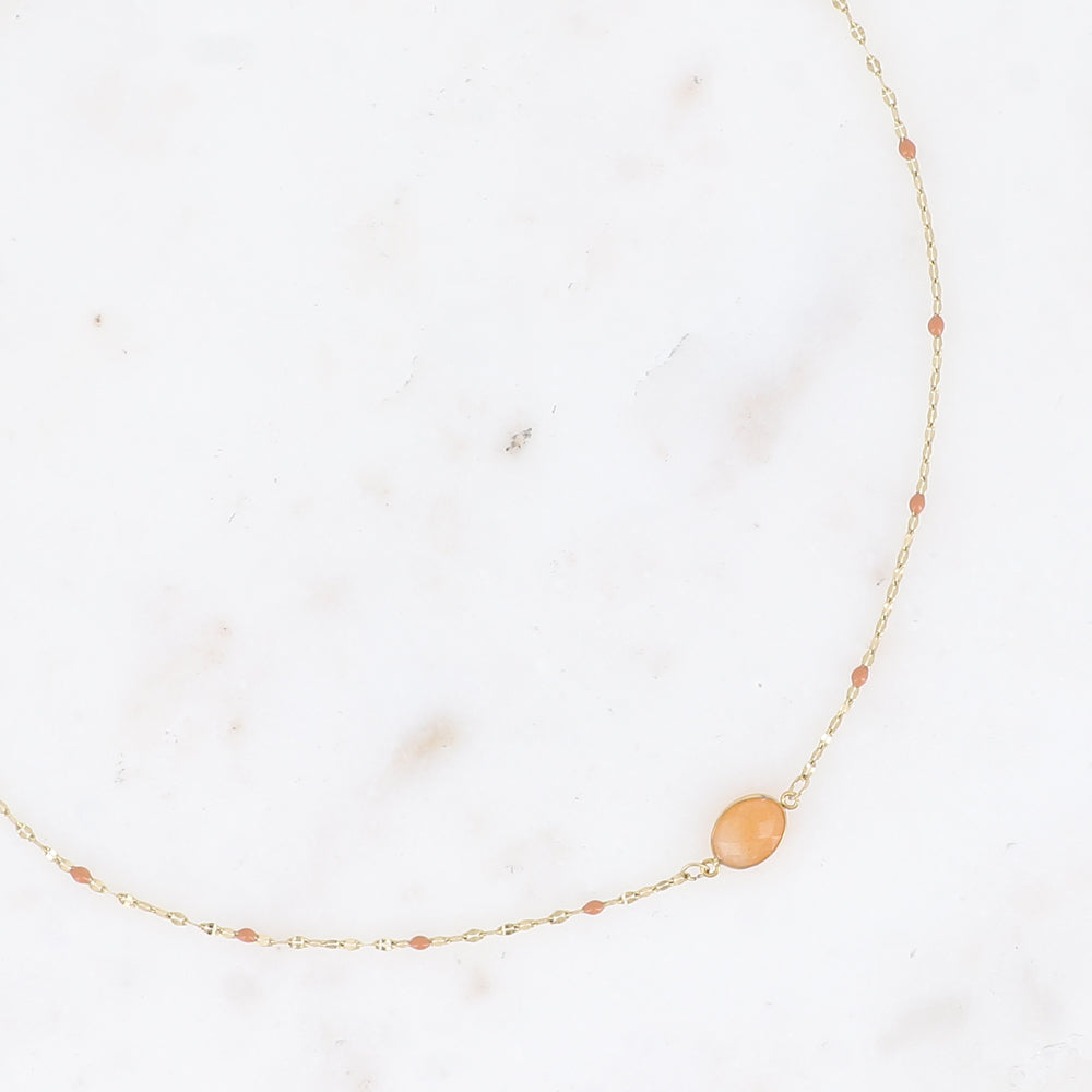 Collier sur chaîne en acier inoxydable composé d'une maille type grain de café écrasée embellie par des touches d'émail coloré et orné d'un pendentif ovale en pierre naturelle.