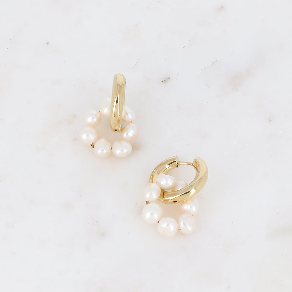 Boucles d'oreilles type créoles avec fermoir à charnière en acier inoxydable composées d'un anneau embelli par des perles d'eau douce.