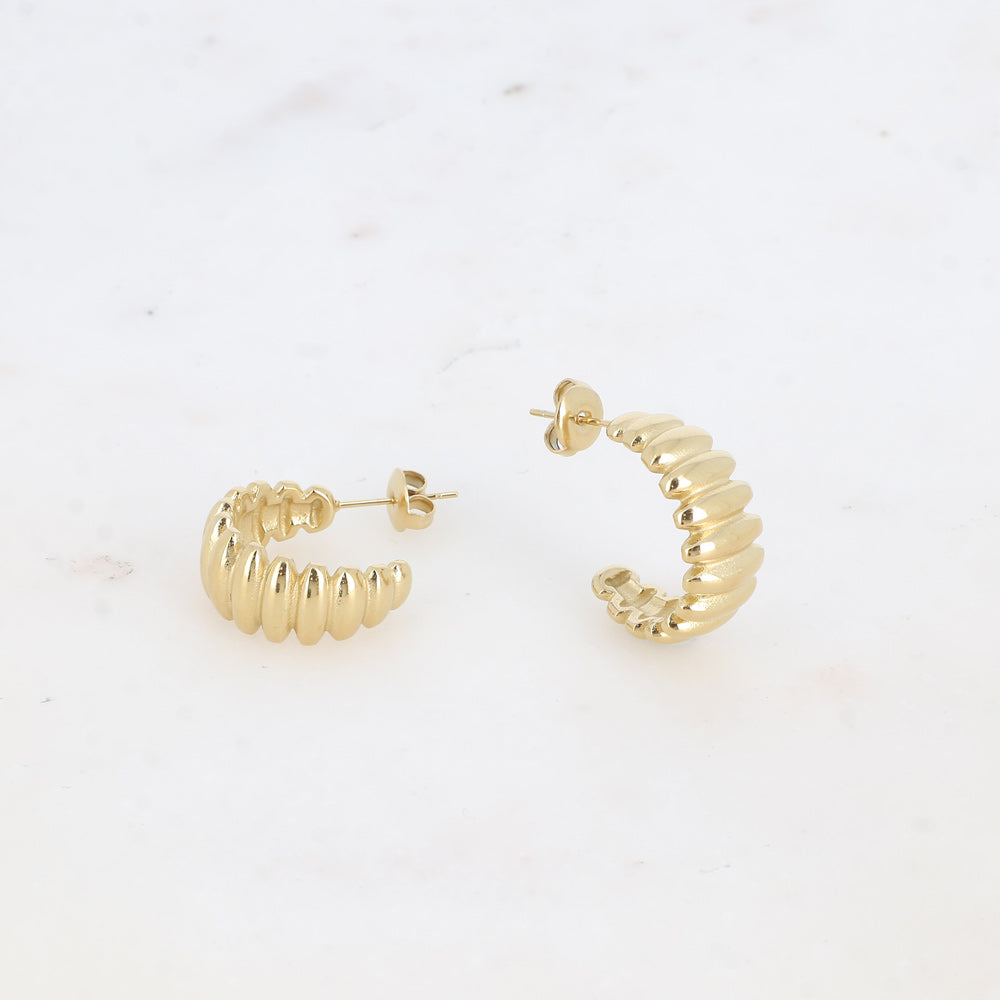 Boucles d'oreilles type créoles en acier inoxydable composées de gravures striées.