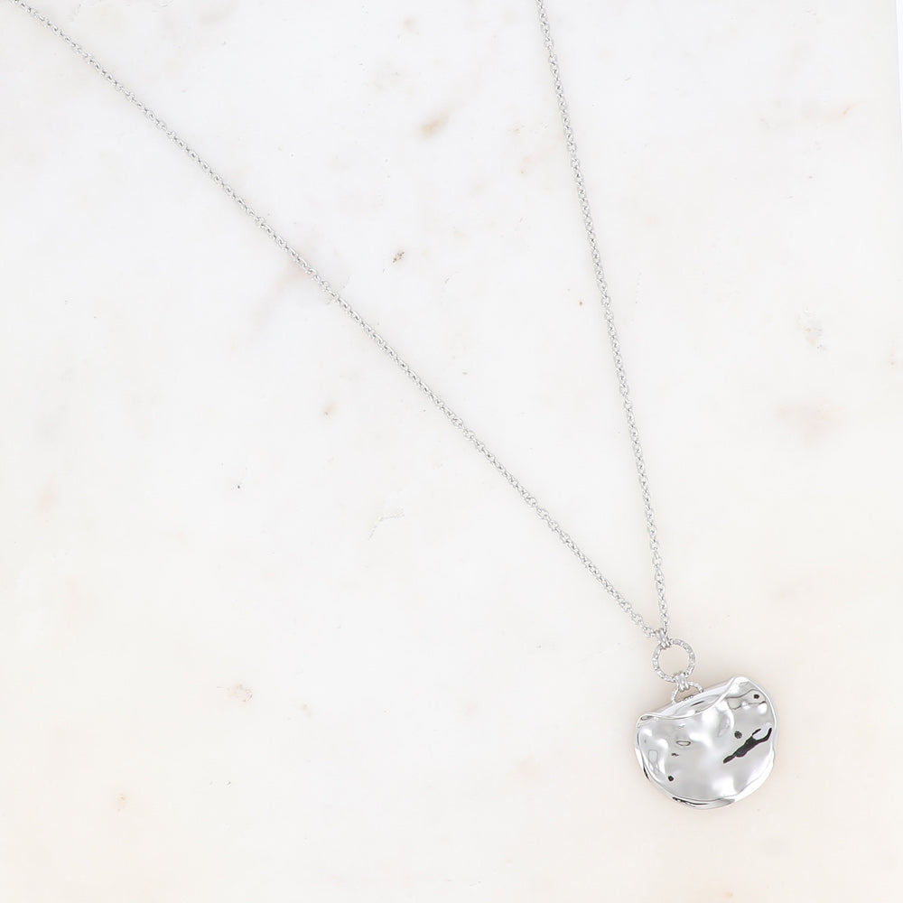 Collier type sautoir en acier inoxydable composé d'une maille forçat, d'un anneau dentelé, d'une pièce recourbée et martelée.