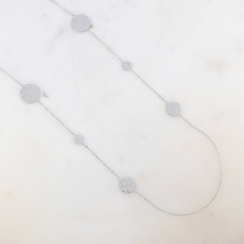 Collier sur chaîne type sautoir composé de sept pièces rondes martelées. Fermoir mousqueton et chaînette réglable.